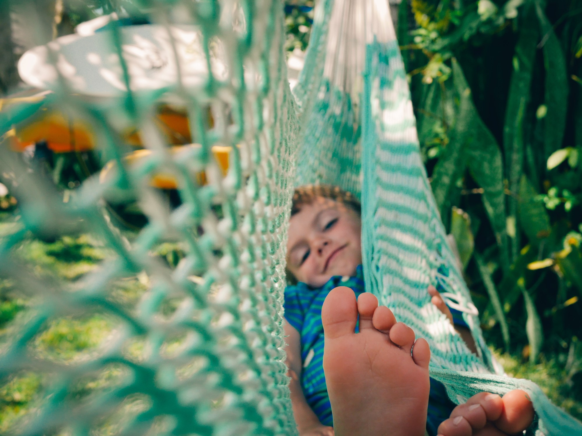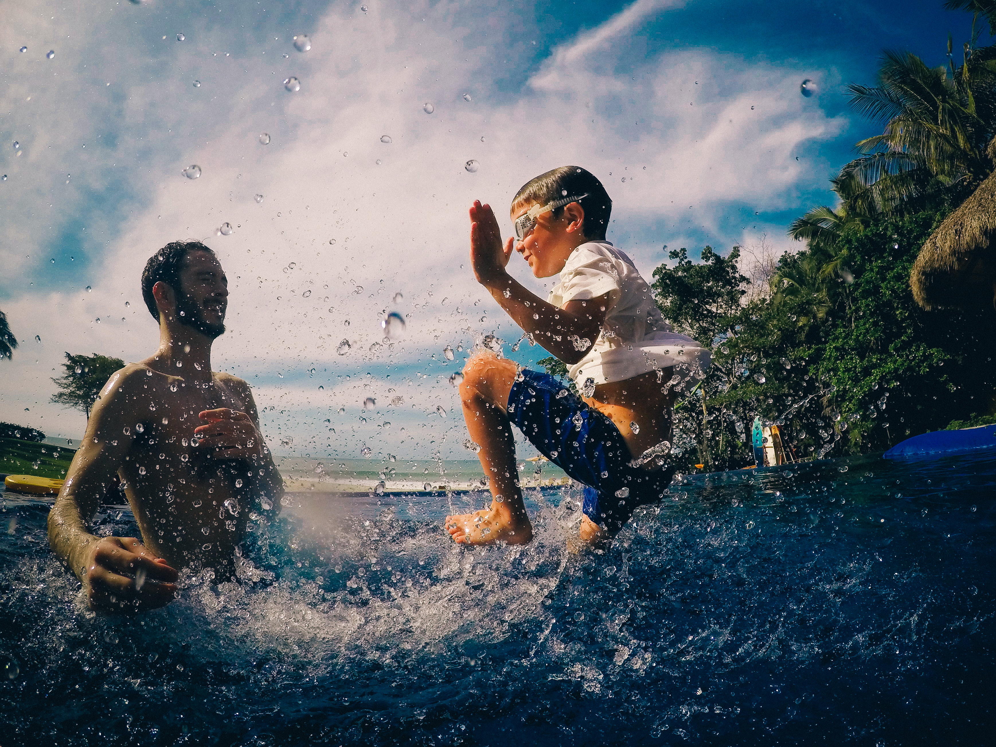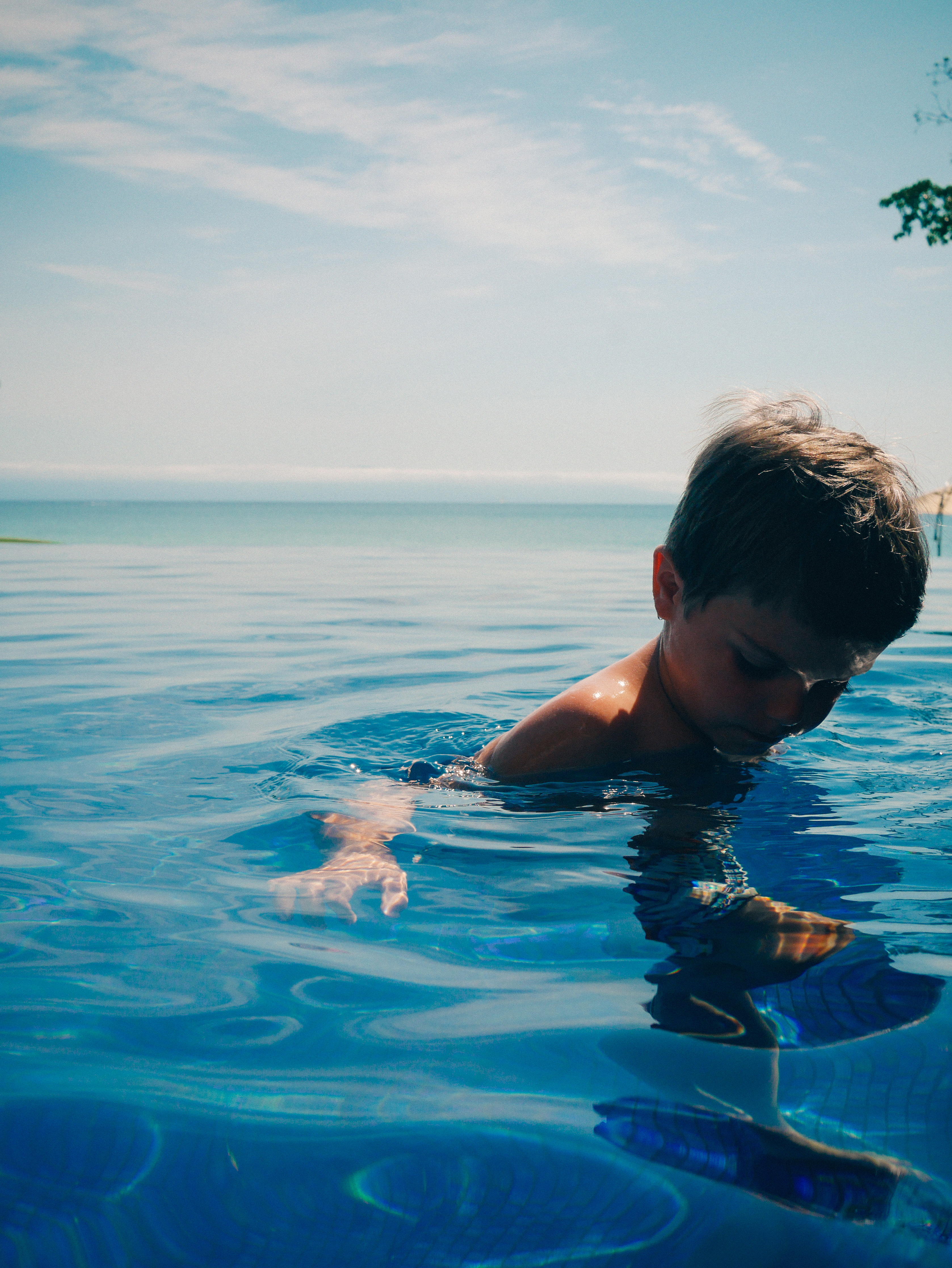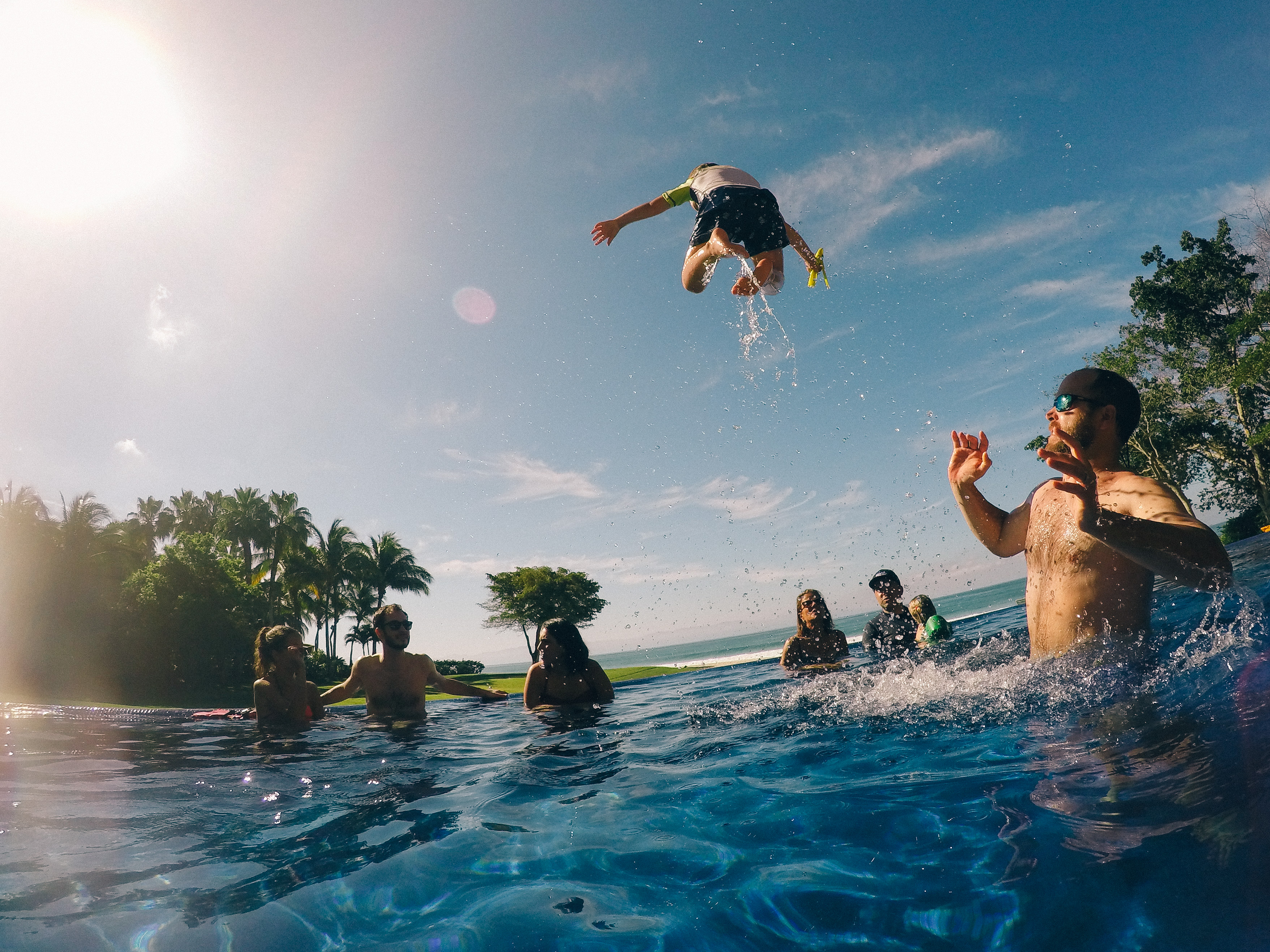 Olly: I’m floating on a giant pillow in the pool with Tita and Henry.