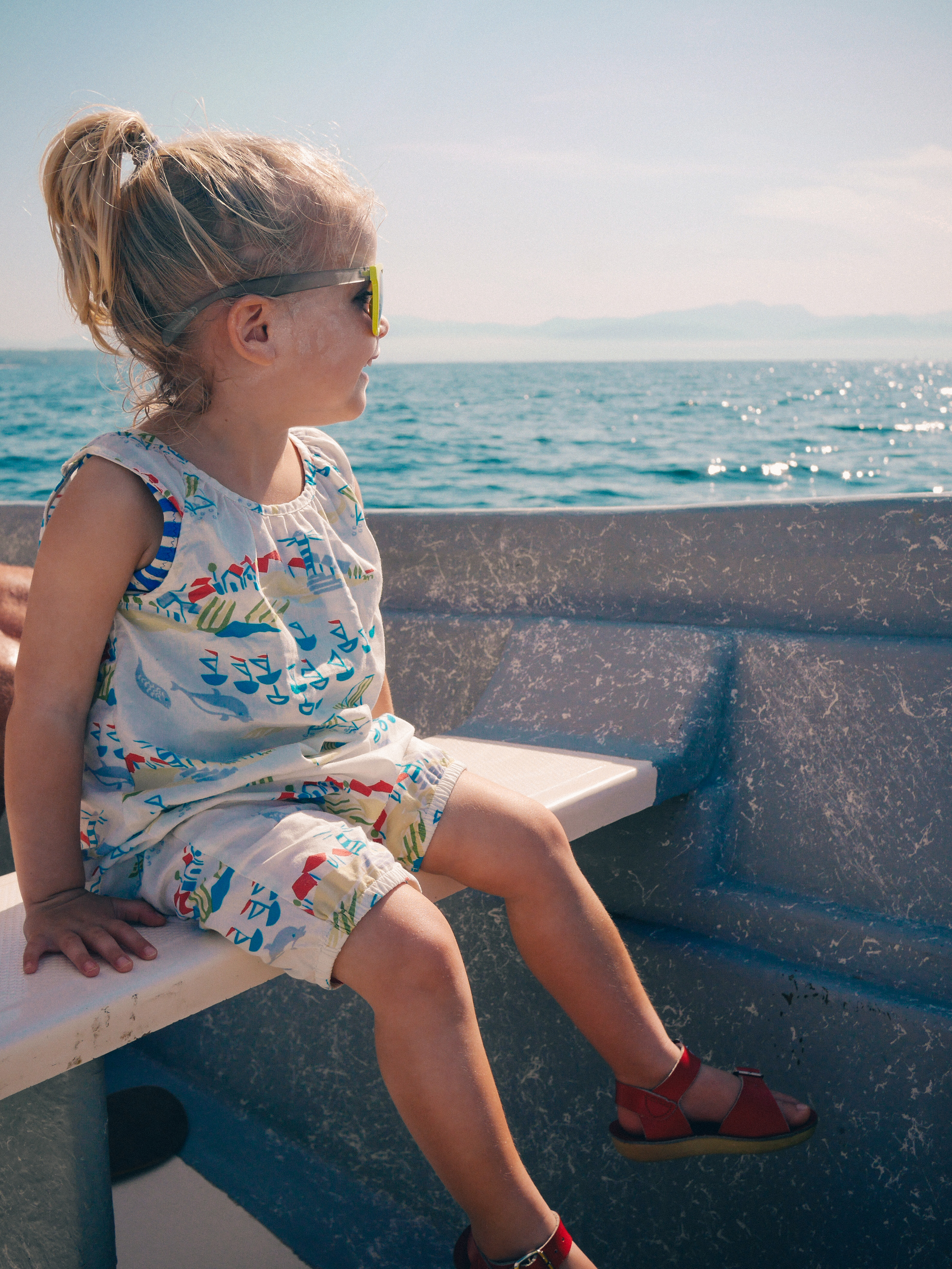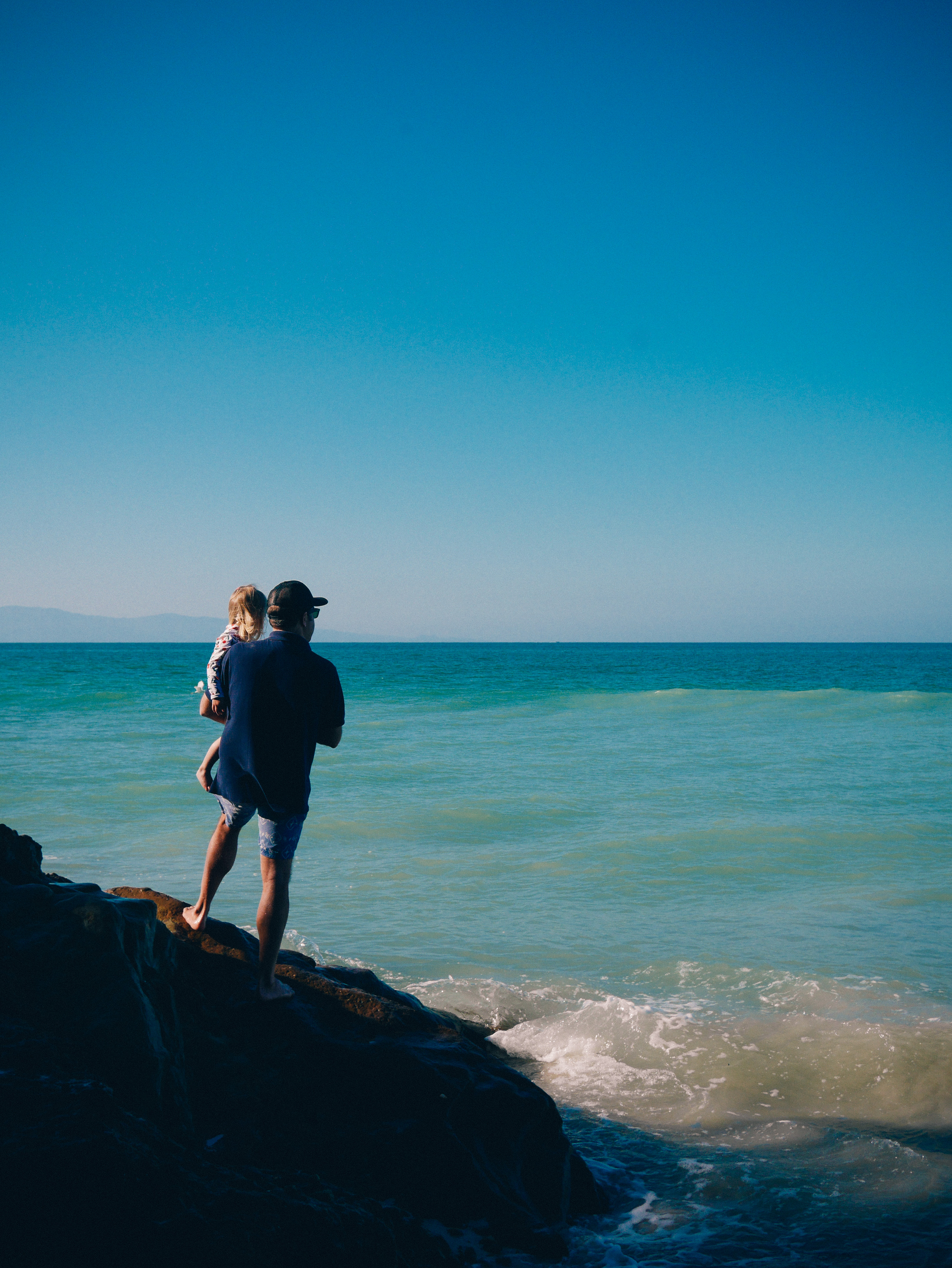 Olly: Dad and Lola are standing a big rock. The ocean looks so blue. I want to jump in.