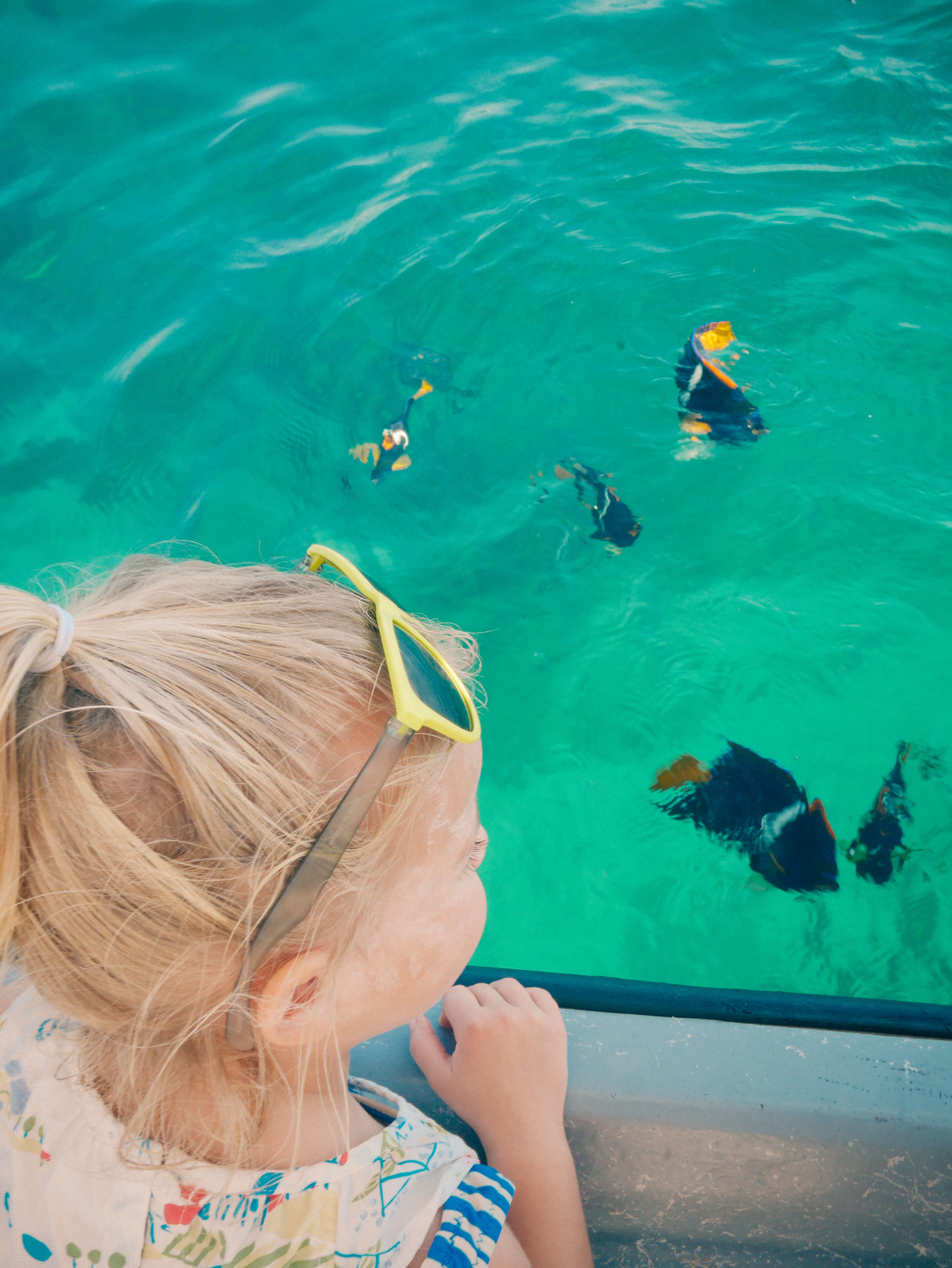 Today we jumped into a swimming pool. We saw a man cut red snapper. I floated in the waves. We fed carp fish.