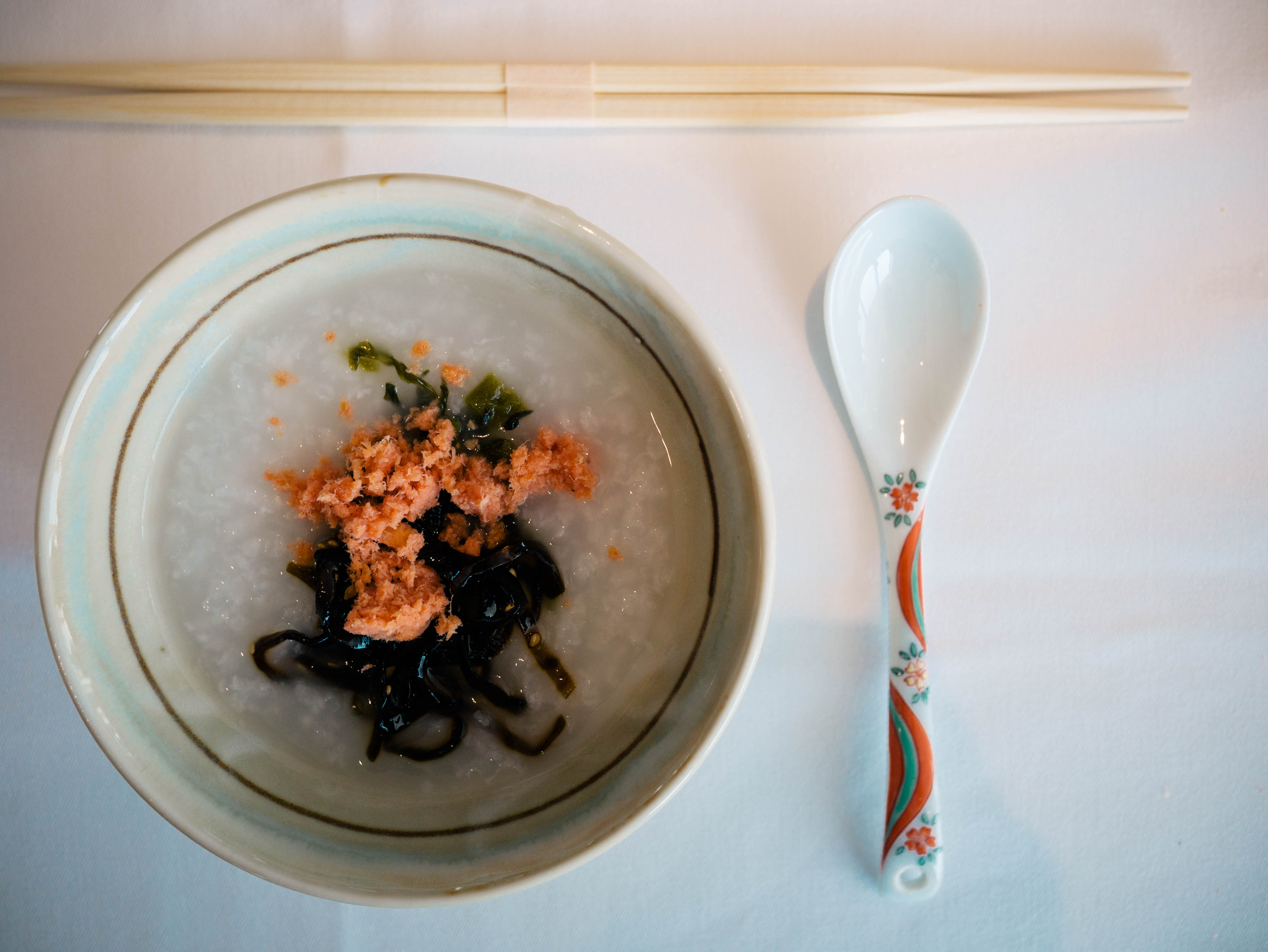 Rice porridge with salmon and seaweed.