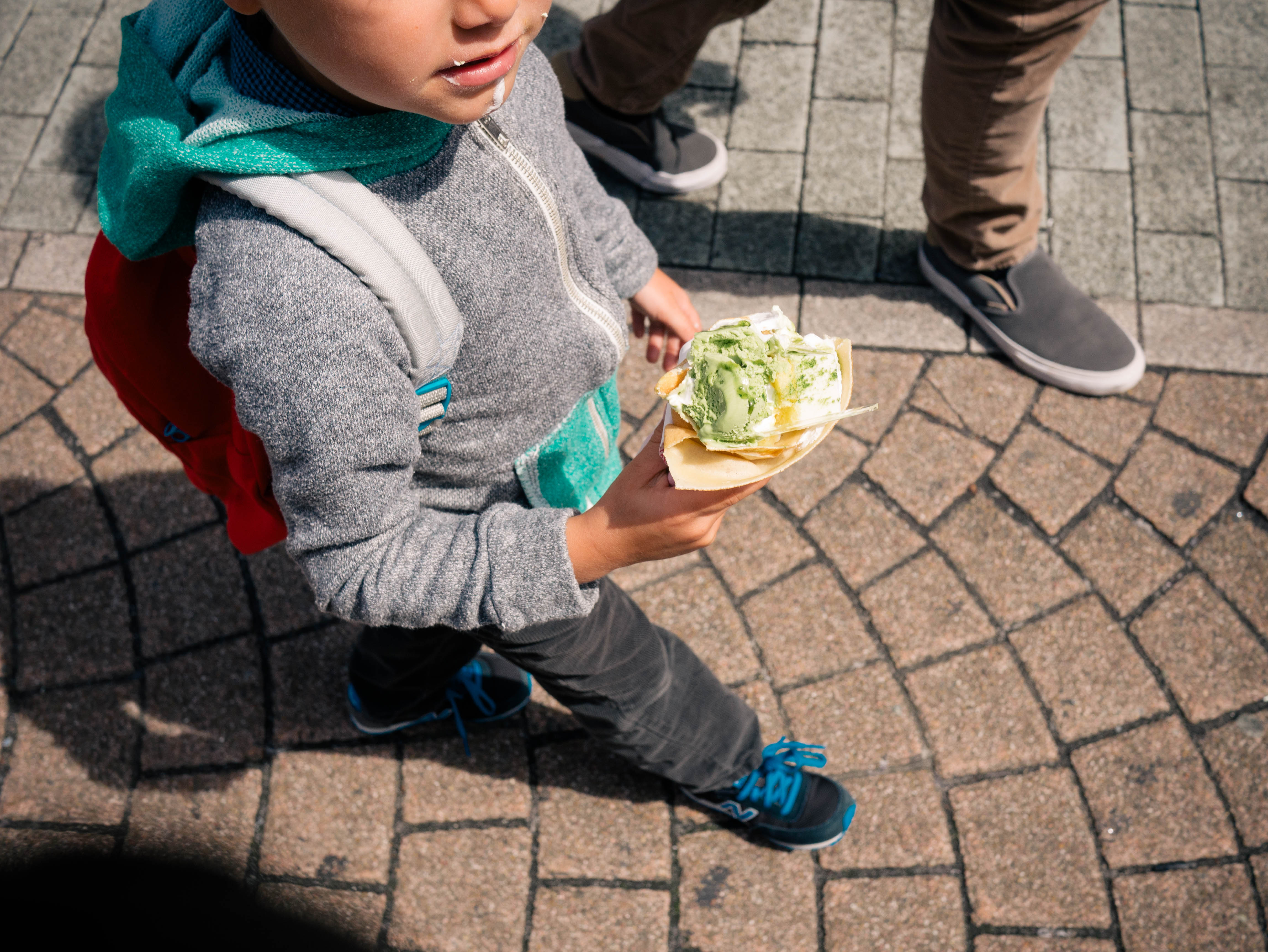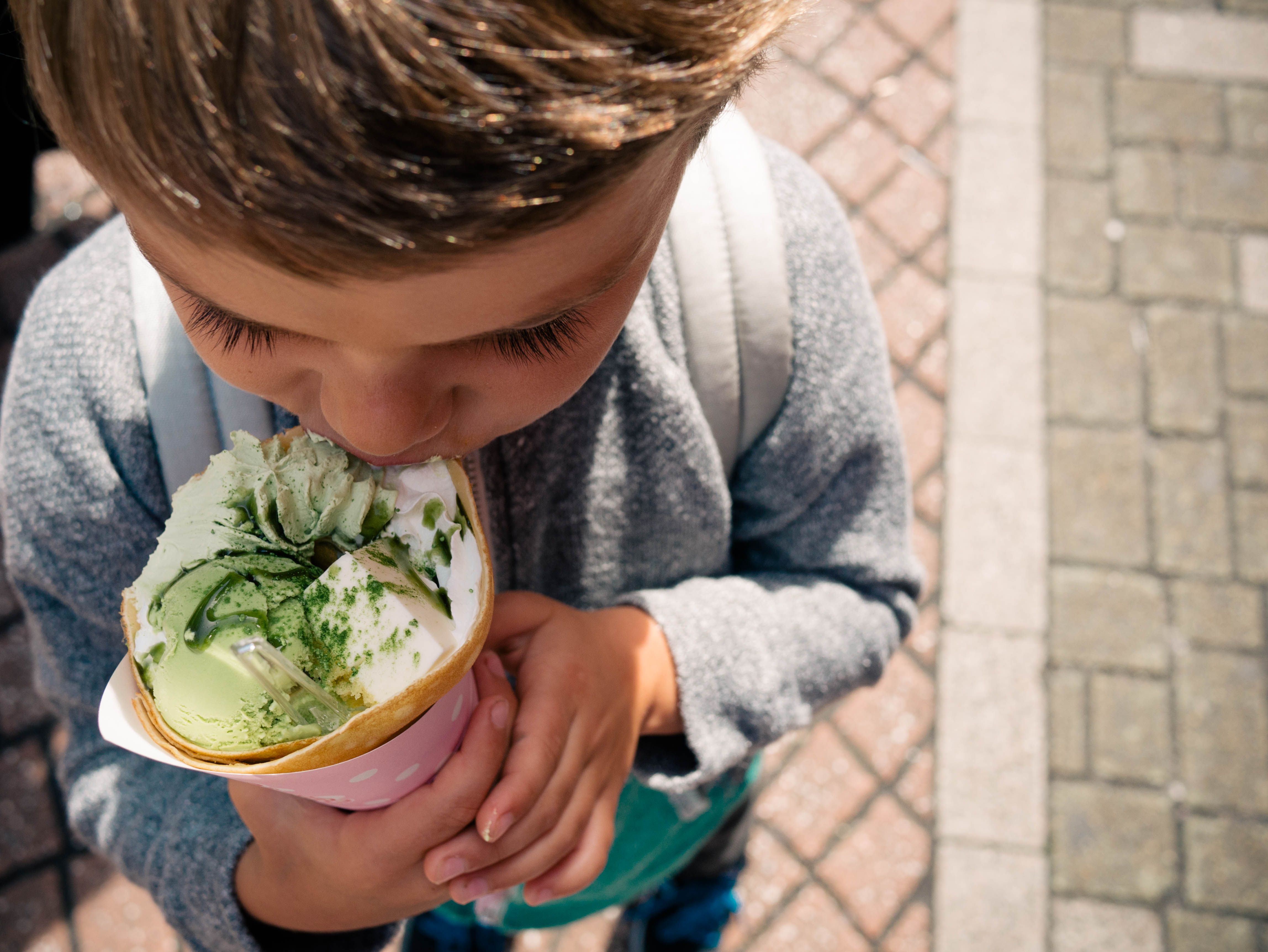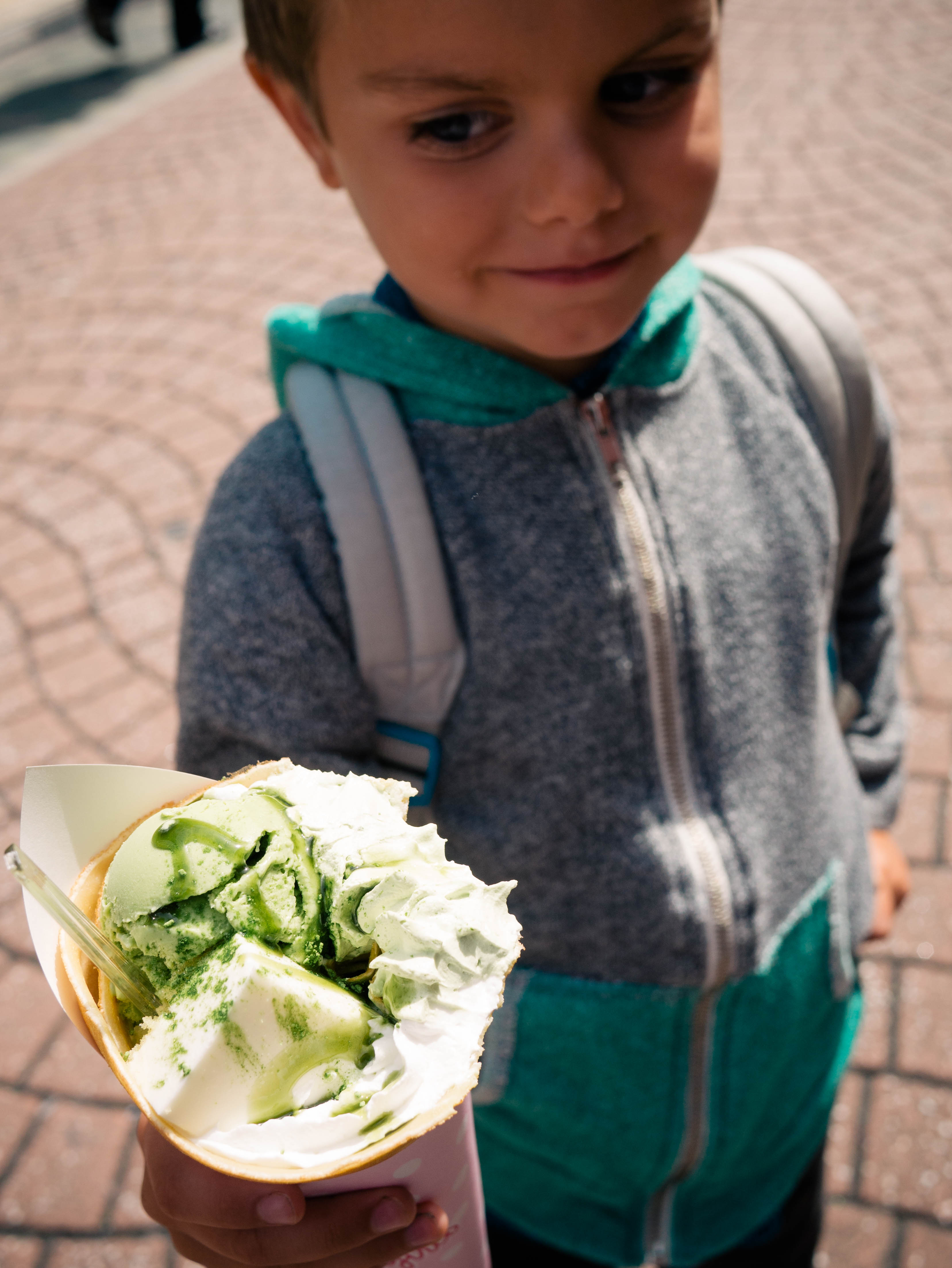 Olly ordered the matcha green tea crepe—not even tempted by the one that had lettuce, tuna, and mayo.
