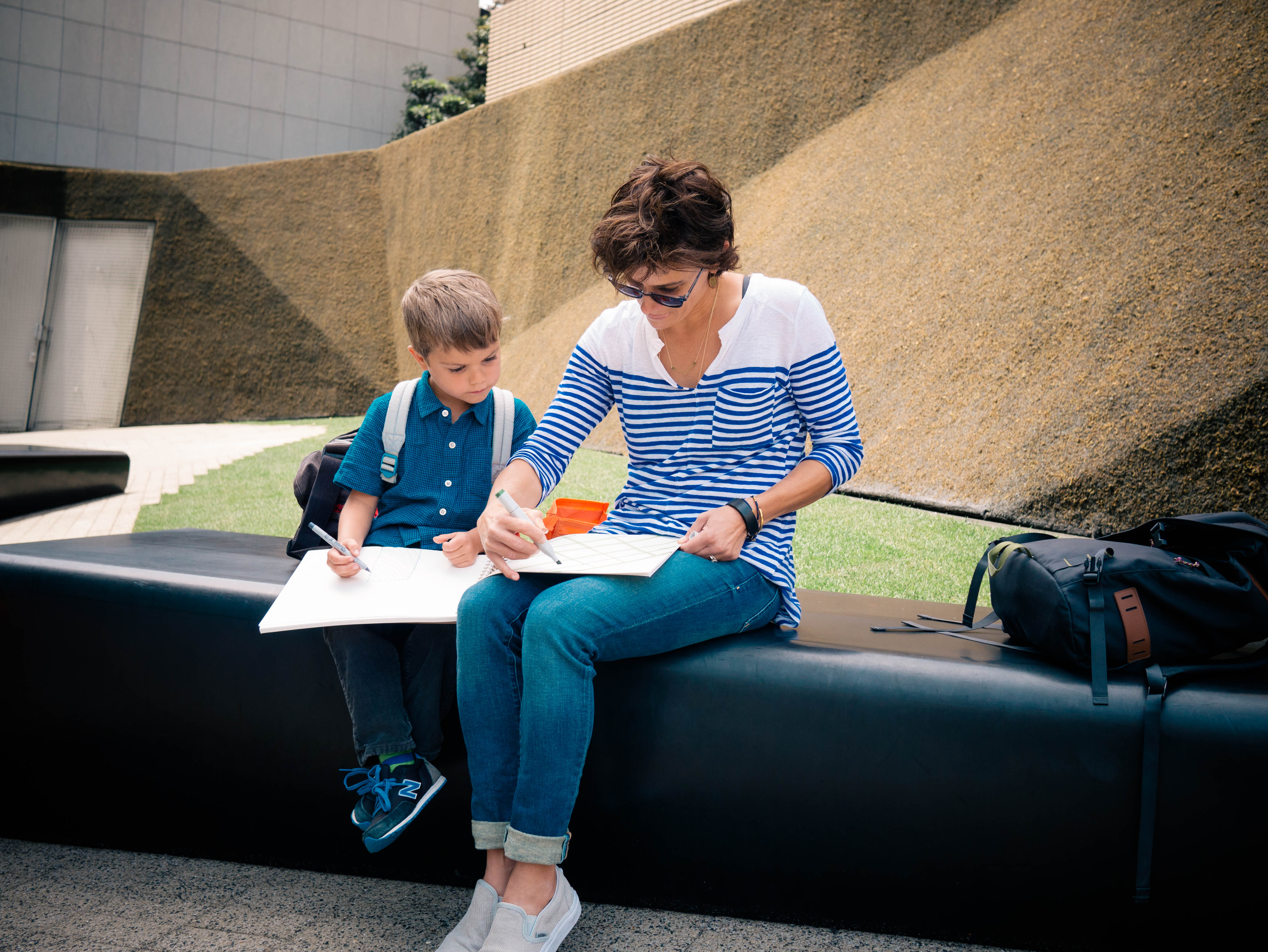 We stopped to stop and rest at the Prada store in Aoyama. There were benches outside, so we sat down and sketched in Olly’s journal. The Prada building has beautiful geometric windows that made for fun drawing. Olly loved how the windows looked flat from the front, but they were actually curved as seen from the side.