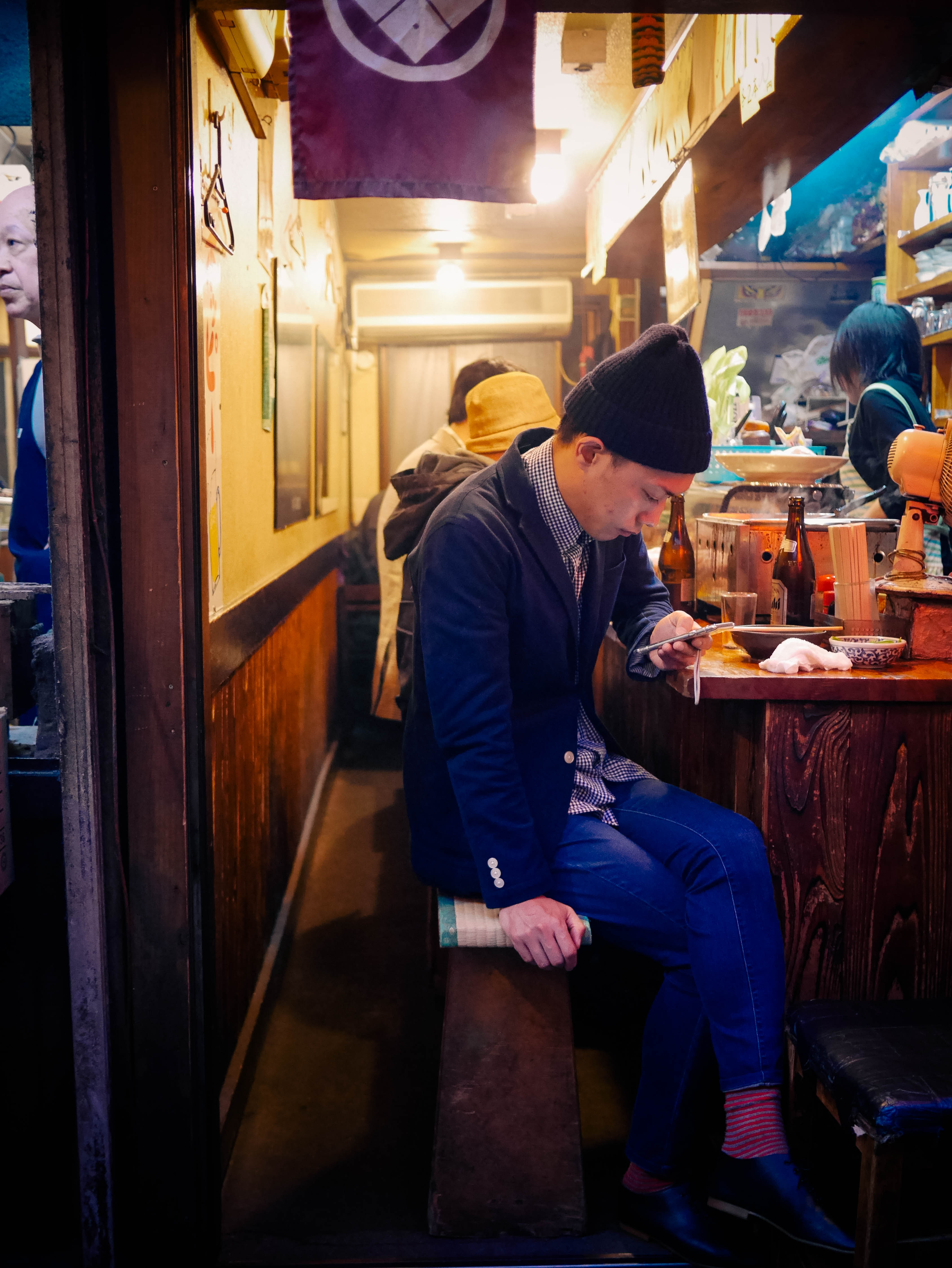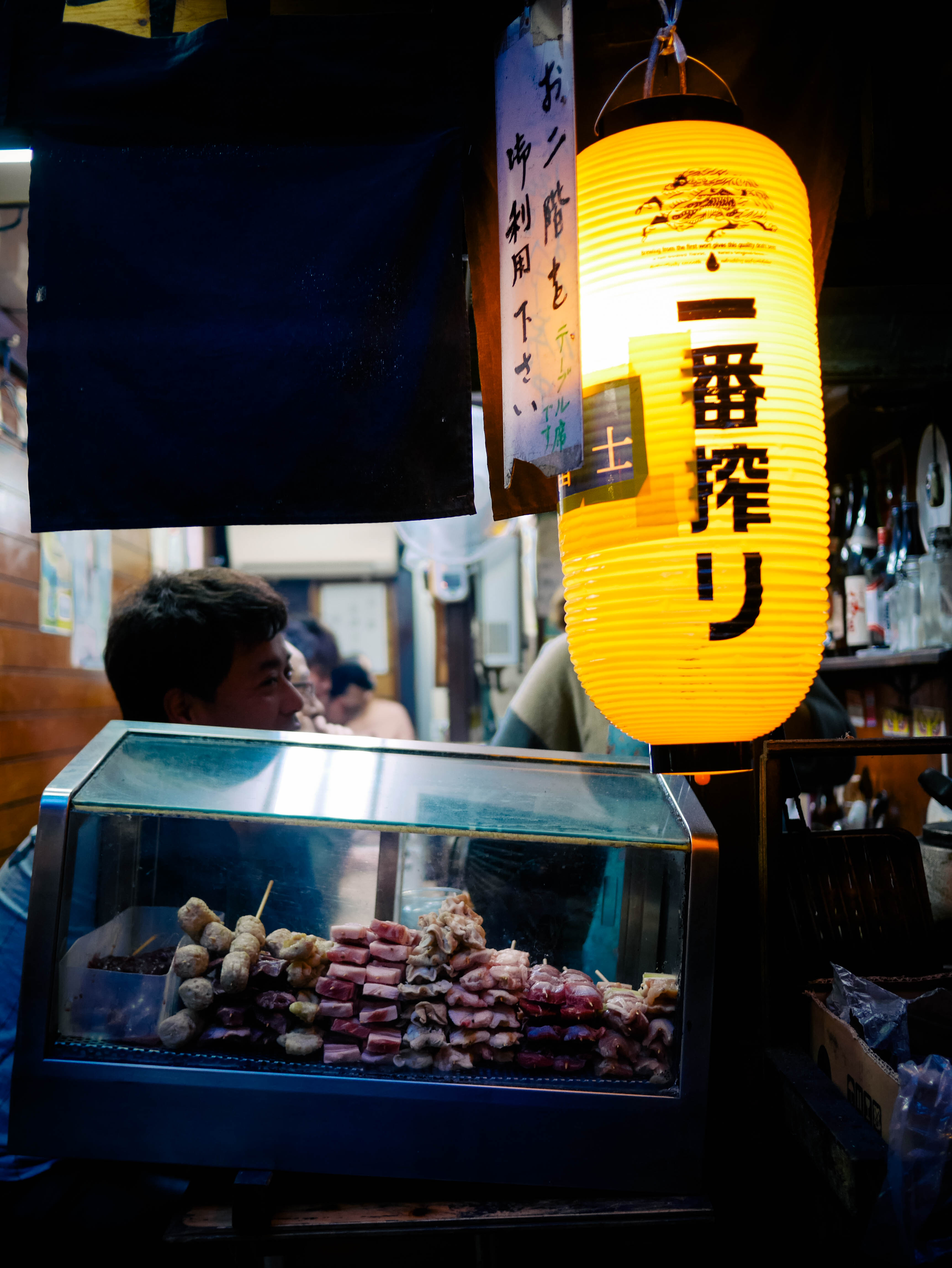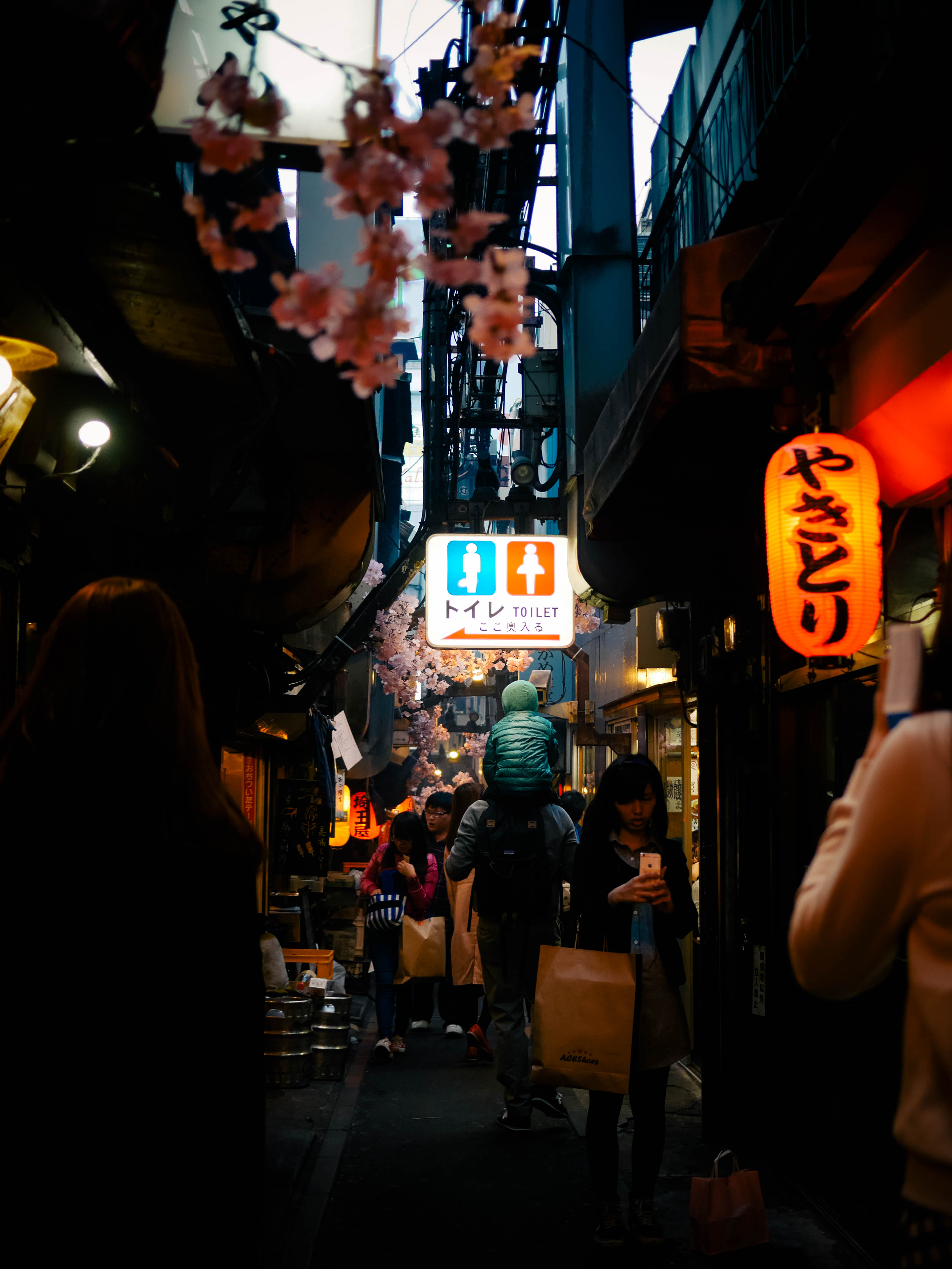 Back out on the street. Exploring the bustling neon of Shinjuku. We ducked off the main road to a small dark alleyway—Omoide Yochiko (below)—where locals dined on yakitori in small stalls that sat 3 or 4 people. Smoke wafted from the small grills—it smelled incredible. We walked up and down the alleyway twice just taking it all in.