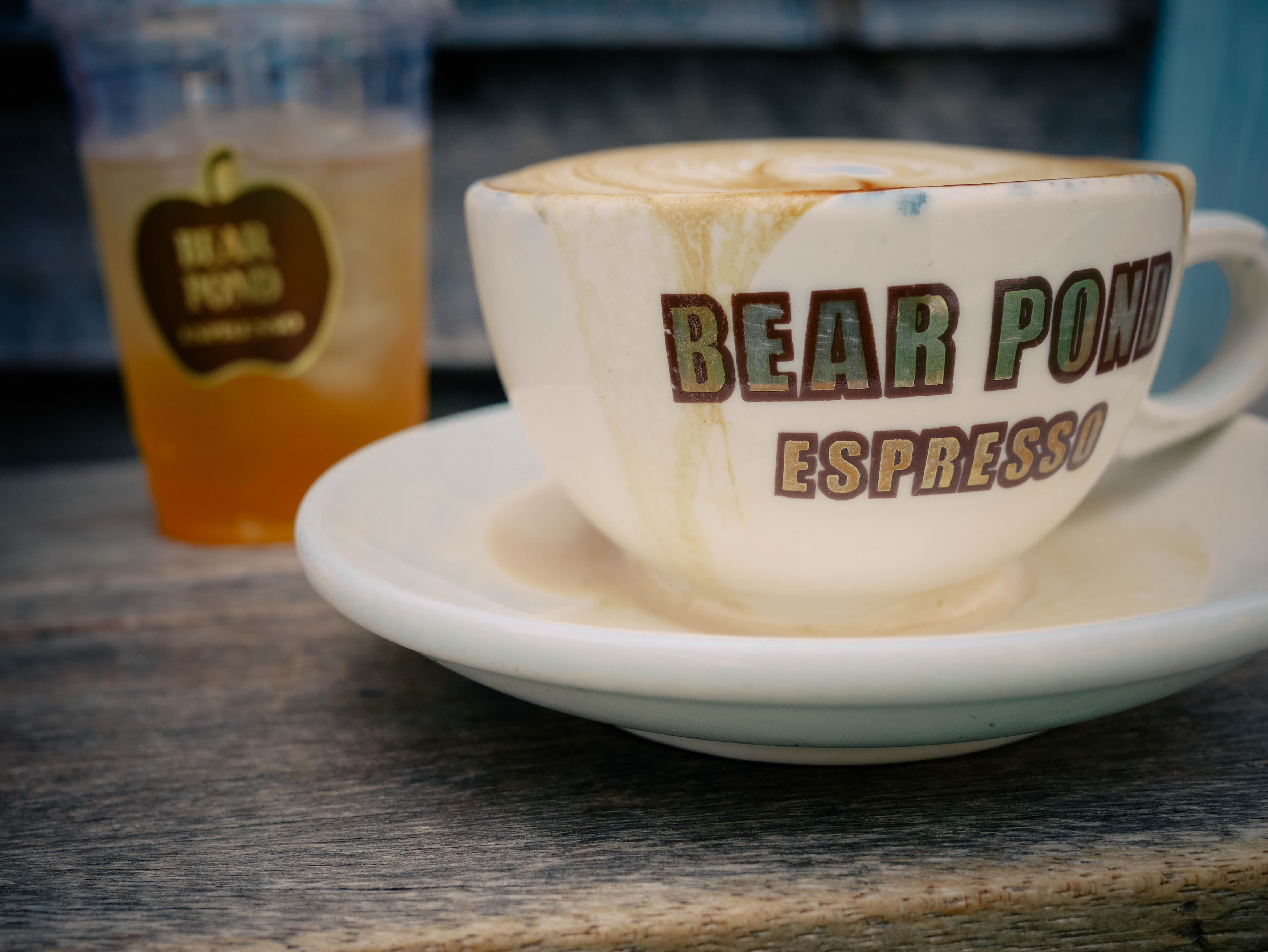 A stop for coffee and apple juice at Bear Pond Espresso.